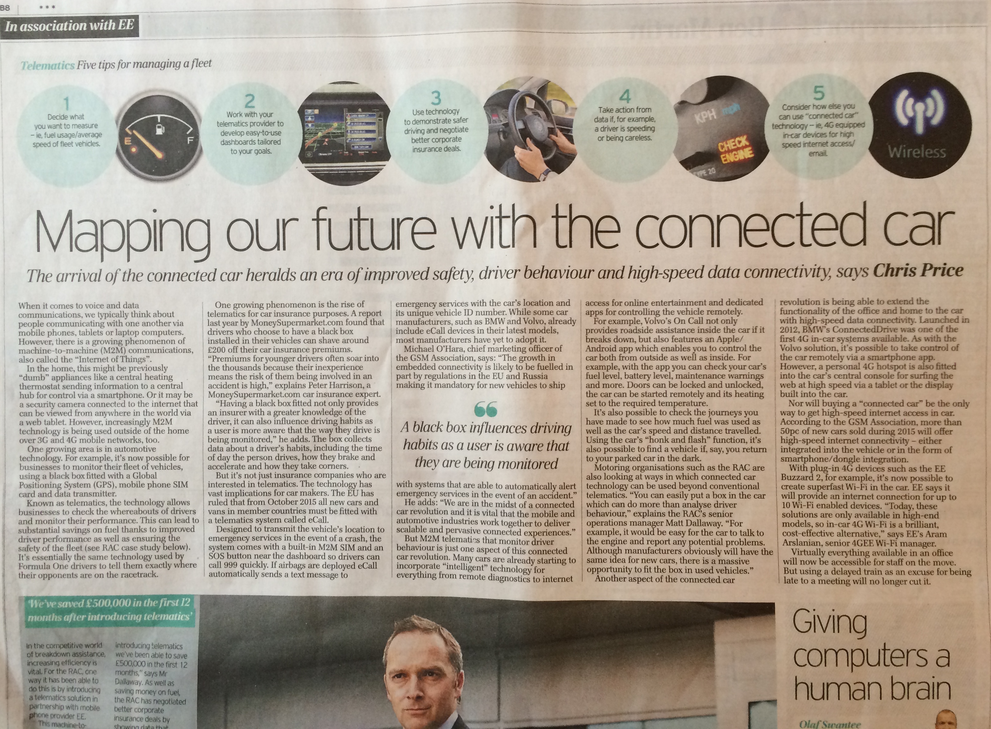I seem to be spending a lot of time writing about in-car tech at the moment. This is a feature I did for The Telegraph on everything from in car black boxes for Telematics to the latest generation of 4G connected cars for safety and infotainment. I also interviewed Matt Dallaway from the RAC (see article below) about the company’s use of telematics in conjunction with EE.